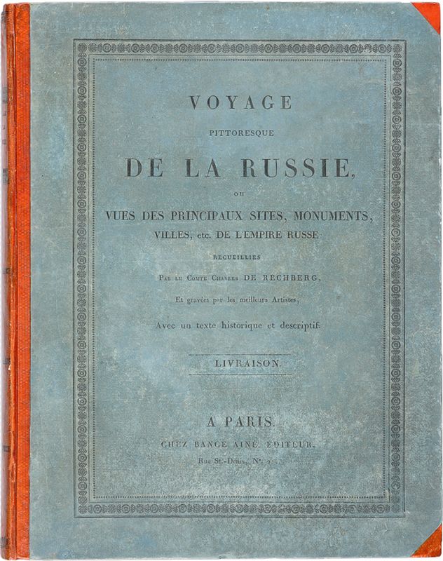 На французском языке. Русский перевод названия: Рехберг Живописное путешествие по России, украшенное 30 гравюрами, собранными графом Карлом Рехбергом, гравированными лучшими художниками, с историческим текстом, составленным Г.-Б. Деппингом