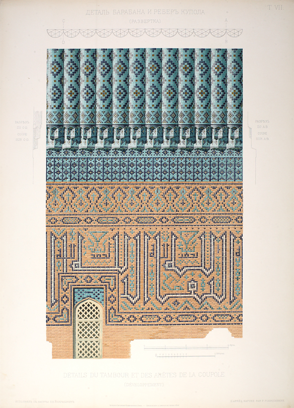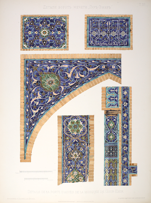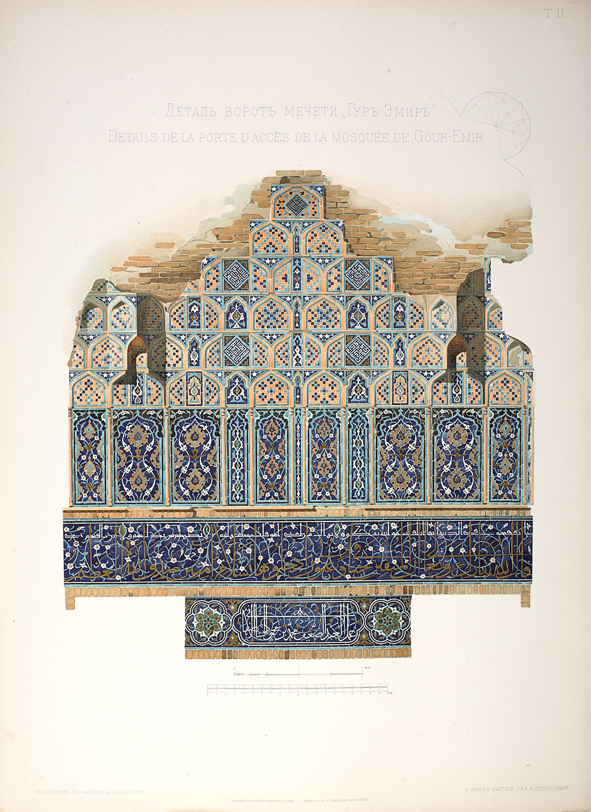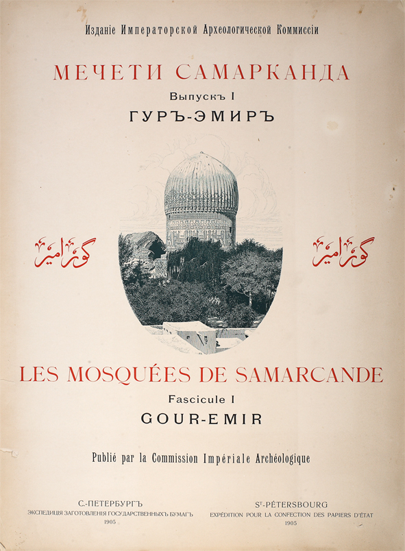 Роскошное иллюстрированное издание, посвященное мечети Гур-Эмир, заложенной Тамерланом в 1404 г. и являющейся его усыпальницей. Содержит общий план мечети, ворот, главного фасада, барабана, купола, а также изображения мраморного трона Тамерлана, его нефритового надгробия и погребального склепа. Эскизы выполнены с натуры архитекторами А. Щусевым, П. Покрышкиным, А. Миненко. Иллюстрации отпечатаны в техниках литографии и хромолитографии