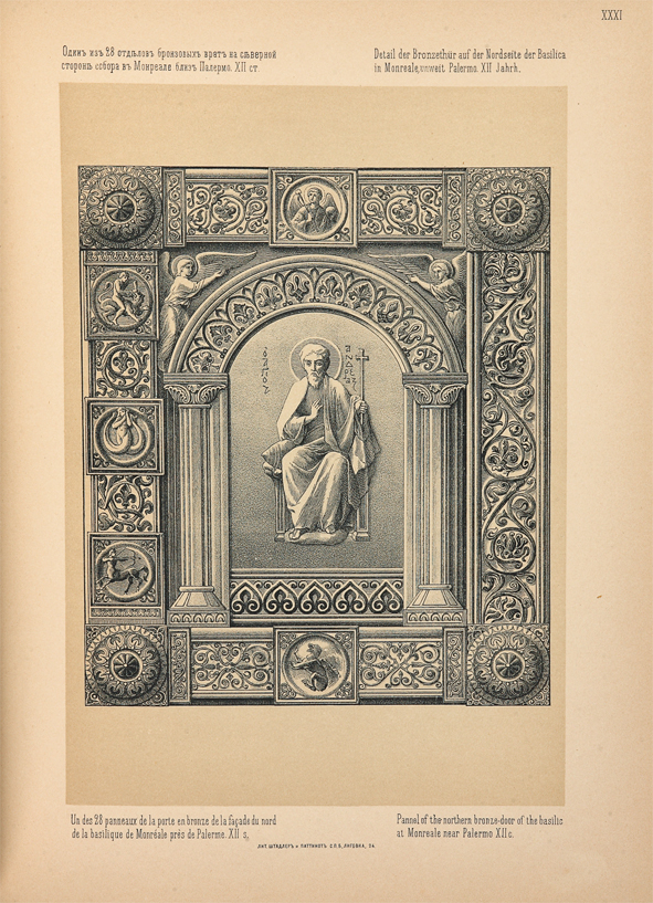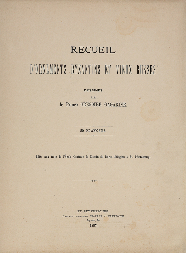 Gagarine G. G. Recueil d'arnaments Byzantins et vieux Russes : 50 planches / Dessinés par le prince Grégorie Gagarine. — St.-Pétersbourg : Édité aux frais de l'École Centrale de Dessin du Baron Stieglitz à St.-Pétersbourg, 1887. — [4] с., 39 л. цв. ил.; 35,5 × 25 см