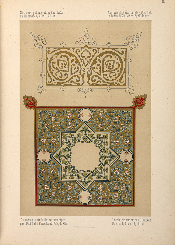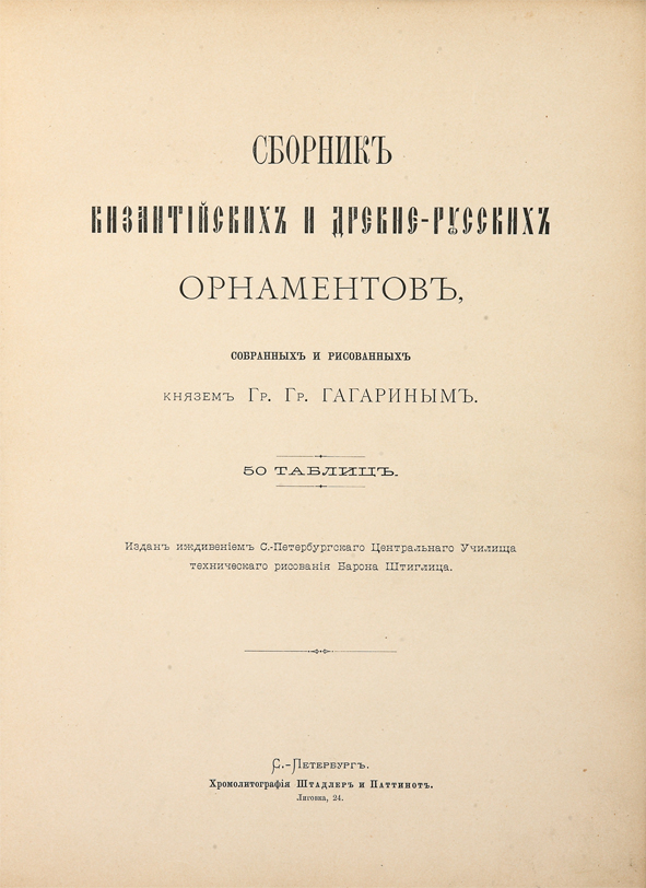 Сборник византийских и древнерусских орнаментов, собранных и рисованных князем Гр. Гр. Гагариным. [Варианты с титульными листами на русском и французском языках]