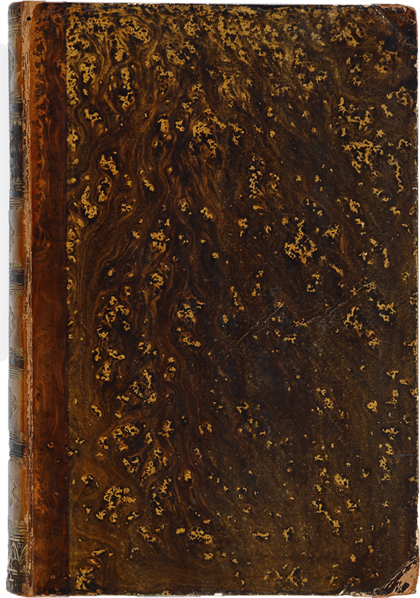 В полукожаном переплете эпохи. Гладкий корешок из светло-коричневой кожи и золотым тиснением. На крышках уголки из коричневой кожи и декоративная мраморная бумага.