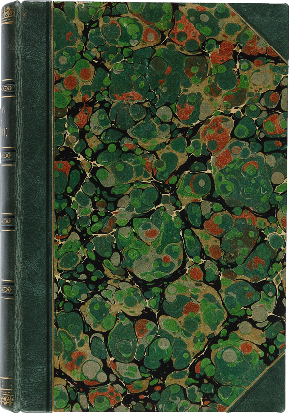 В полукожаном переплете. Корешок из зеленой кожи с фальш-бинтами и золотым тиснением. На крышках уголки из зеленой кожи и мраморная бумага. На титульном листе штемпельный экслибрис А. А. Маркова.