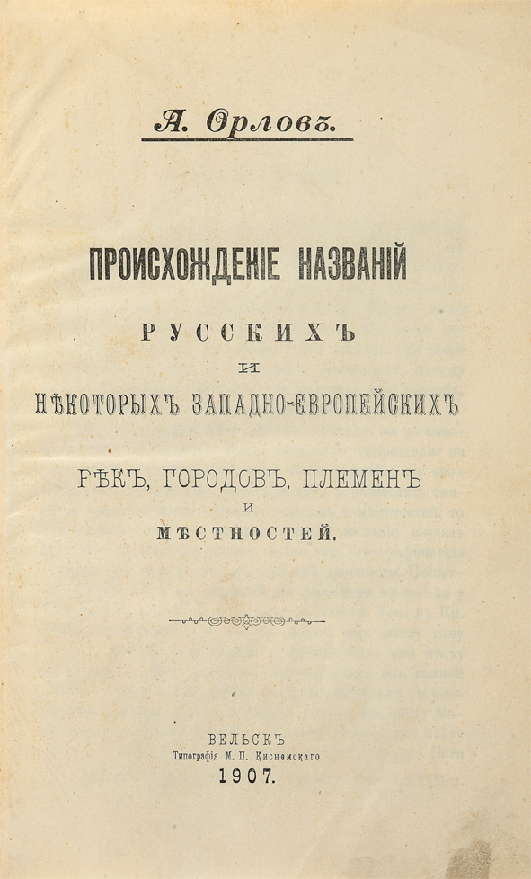 Редкое провинциальное издание. Книга посвящена исследованию происхождения топонимов (названий географических объектов) России и некоторых европейских стран. Орлов рассматривает и объясняет историю и значения названий рек, городов, племён и мест на территории России, а также некоторых знаменитых географических объектов Западной Европы.