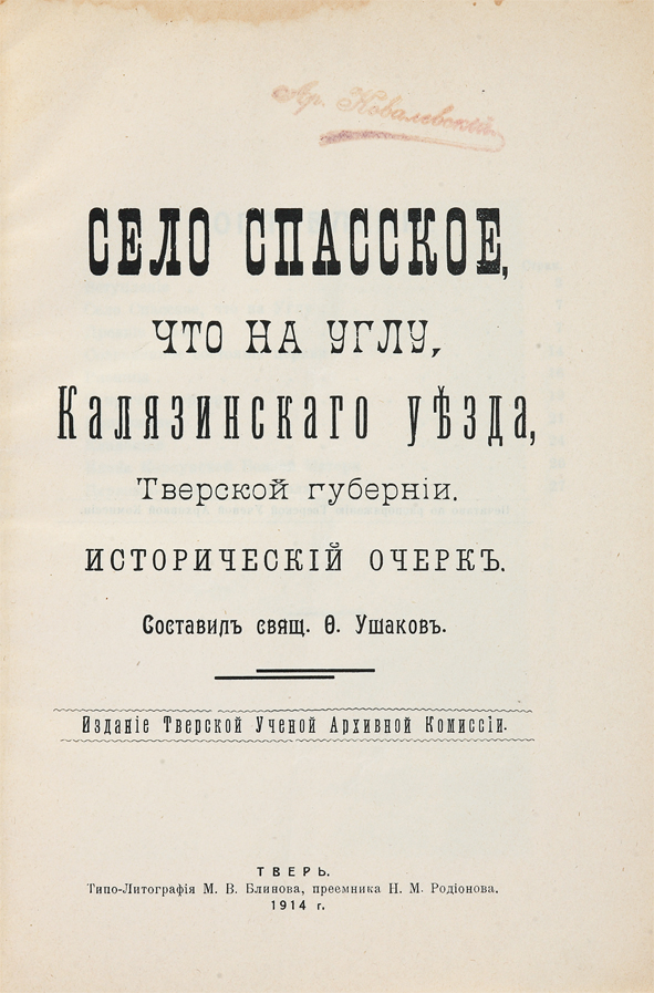 Село Спасское, что на углу Калязинского уезда Тверской губернии. Исторический очерк. Издание Тверской ученой архивной комиссии