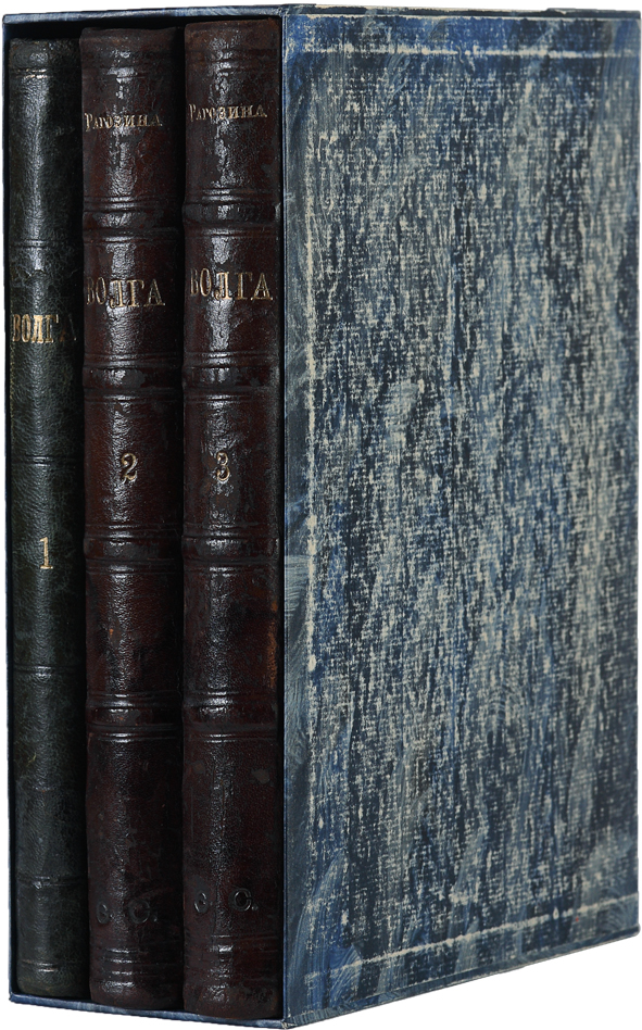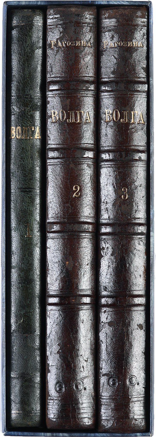В трех полукожаных переплетах эпохи. Том первый с гладким корешком и мраморной бумаге на крышках. Тома второй и третий с бинтовыми корешками и текстурным коленкором на крышках. Библиофильский футляр.