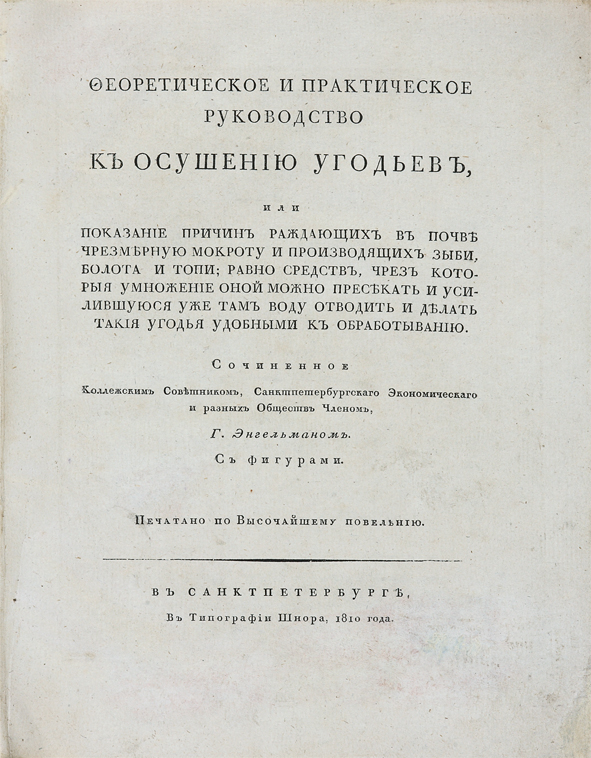 Феоретическое и практическое руководство к осушению угодьев, или Показание причин, раждающих в почве чрезмерную мокроту и производящих зыби, болота и топи; равно средств, чрез которыя умножение оной можно пресекать и усилившуюся уже там воду отводить и делать такия угодья удобными к обрабатыванию. Cочиненное коллежским советником Санктпетербургскаго экономическаго и разных обществ членом, Г. Энгельманом. С фигурами. Печатано по высочайшему повелению