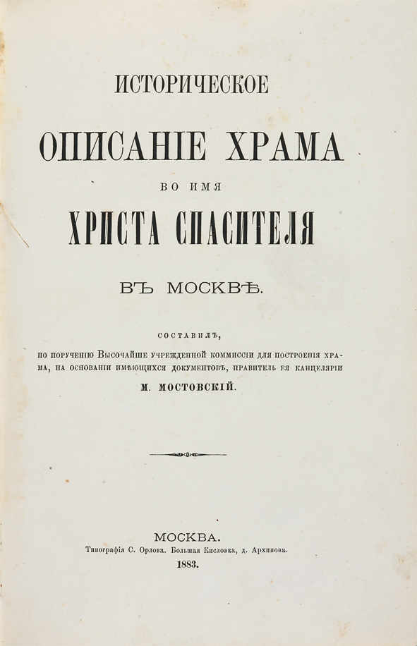 Историческое описание Храма во имя Христа Спасителя в Москве / Составил по поручению Комиссии для построения храма на основании имеющихся документов правитель ее Канцелярии М. Мостовский