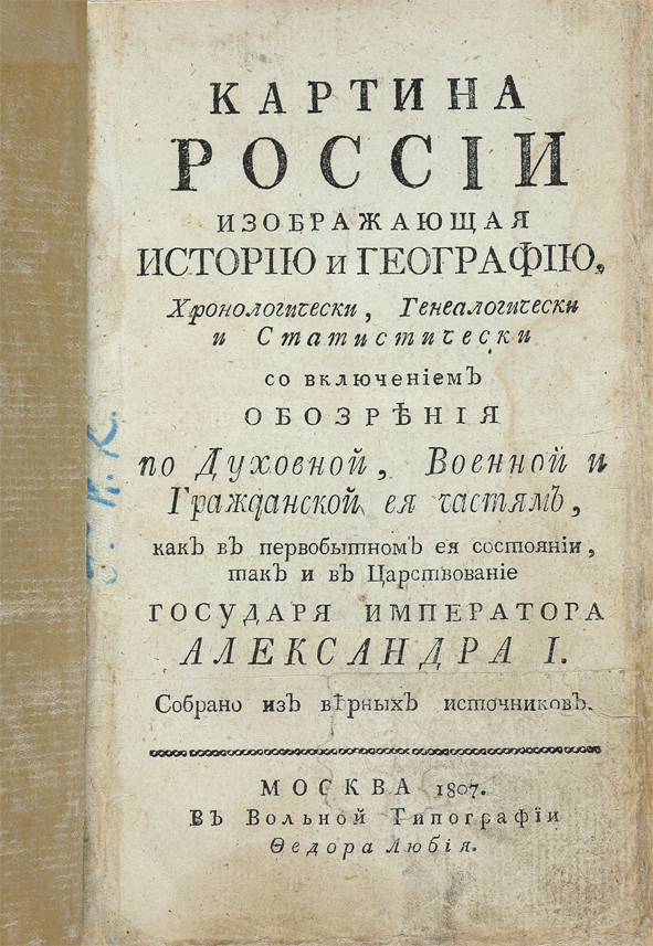 Картина России изображающая историю и географию, хронологически, генеалогически и статистически со включением обозрения по духовной, военной и гражданской ея частям, как в первобытном ея состоянии, так и в царствование государя императора Александра I. Собрано из верных источников