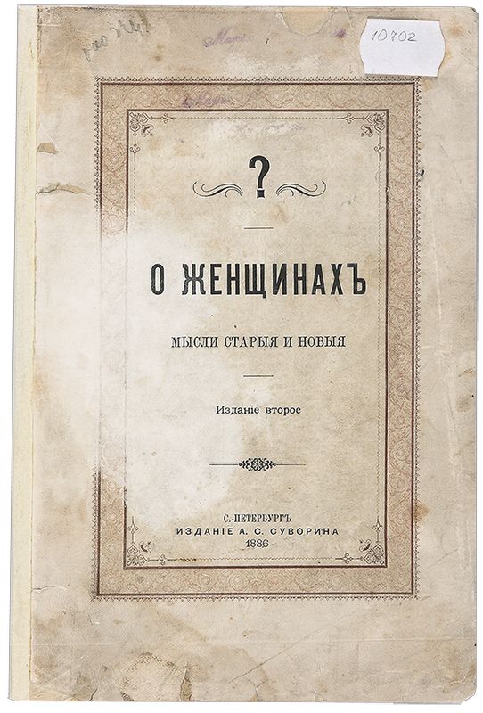 [Скальковский К. А.] О женщинах. Мысли старые и новые. Второе издание значительно дополненное. СПб.: Издание А. С. Суворина, 1886. — Х, [1], 409 c.;