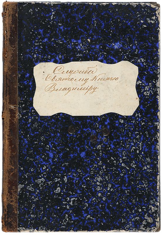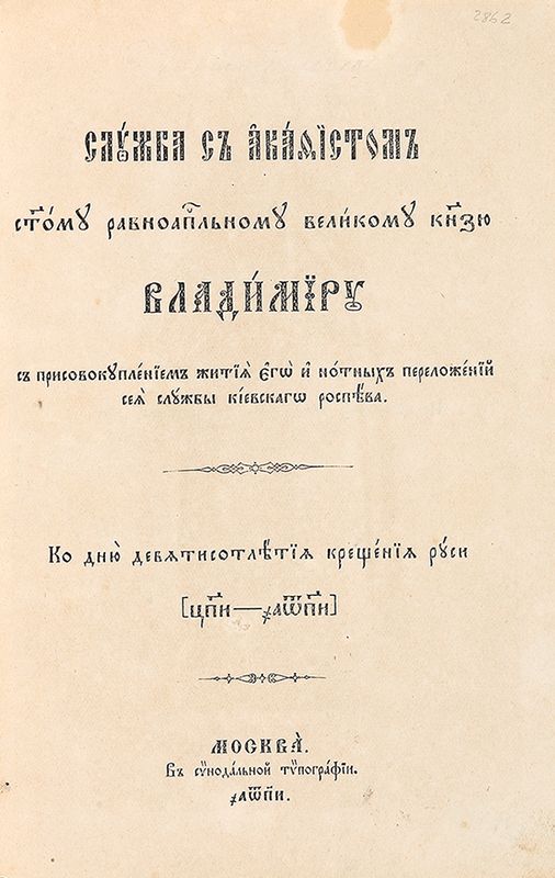 Служба с акафистом Святому Равноапостольному Великому Князю Владимиру с присовокуплением жития его и нотных переложений сея службы киевского роспева. Ко дню девятисотлетия крещения Руси [988–1888]. М.: В Синодальной типографии, 1888. — 95 с., 1 л. ил.; 22,2 х 15 см